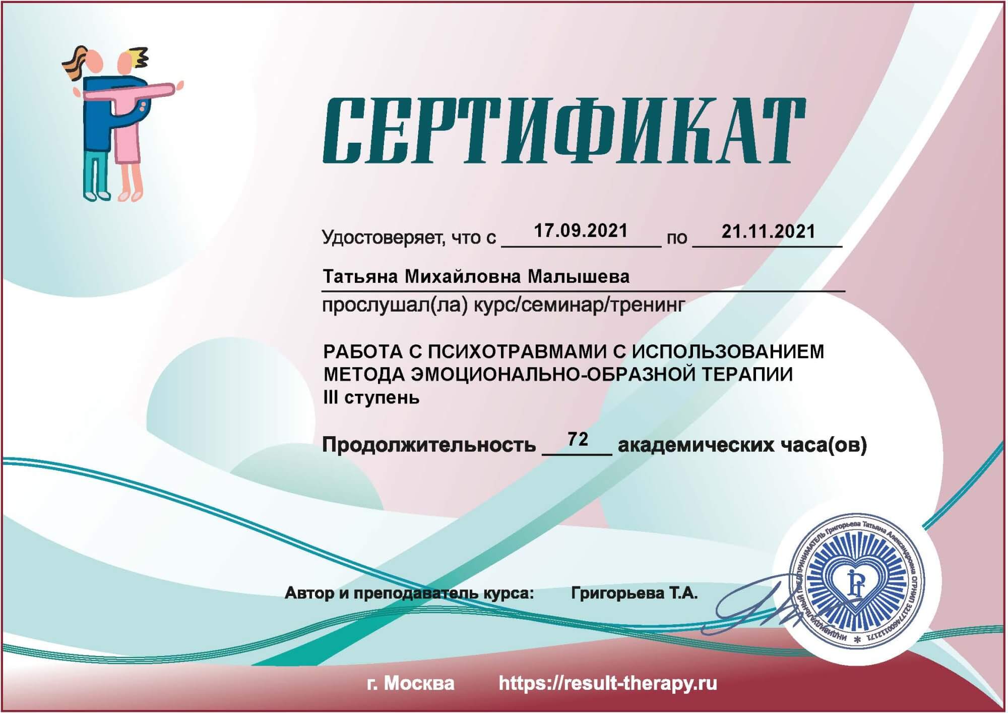 - Григорьева Т.А. Работа с психотравмой методом эмоционально-образной терапии 2020-2021 г.